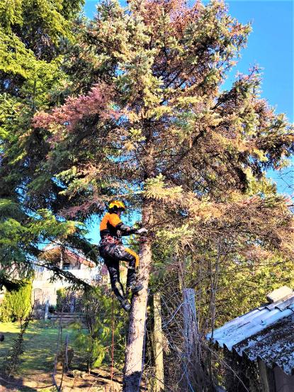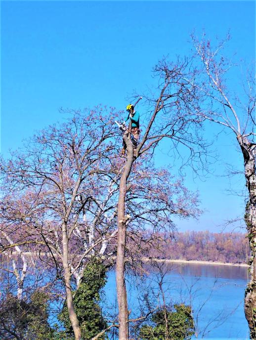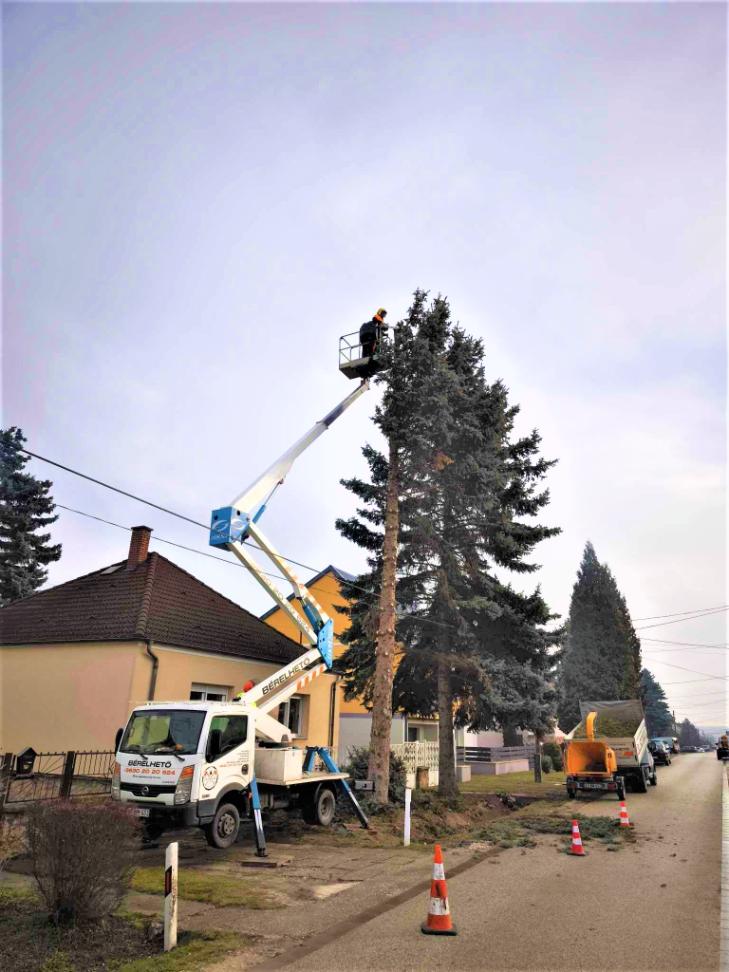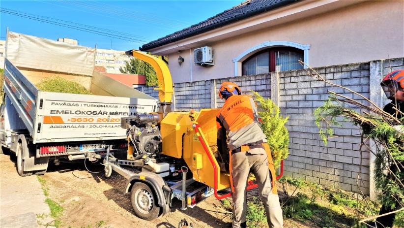 Fakivágás alpintechnikával – emelőkosaras daruval – fadöntés – bozótirtás – ágdarálás – fakivágási engedély – daru bérlés – tuskómarás Komárom.